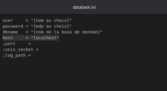 Une fois dans le fichier, définir un “user”, un “password”, un “databasename” (basiquement le nom du dossier renommé plus tôt) puis compléter la ligne “host=localhost”