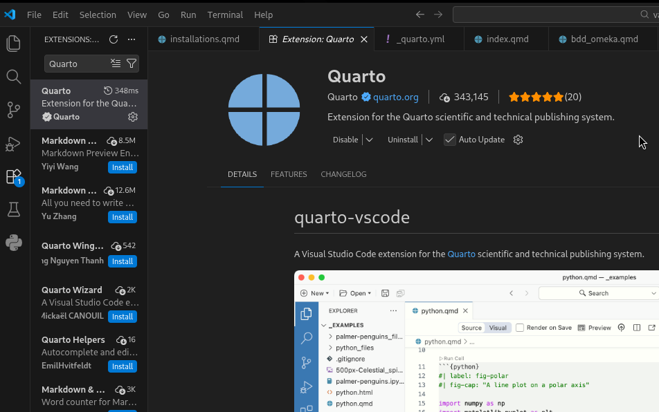 L’avantage d’utiliser VSCode, en plus qu’il gère nativement de nombreux langages informatiques, est qu’il est possible d’y attacher de nombreux modules pour peaufiner l’usage de VSCode. Voici quelques modules très utiles